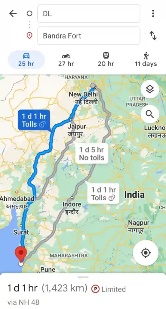 जैसे ही आप गूगल मैप में इतना सर्च करते है Google Map App आपको बता देगा कि Mumbai से Delhi की कितनी दूरी है और इस दूरी को कितना समय में तय किया जा सकता है जैसा आप इस चित्र में देख पा रहे है।