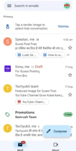 1. अगर आपने पहले से Gmail App में लॉगइन किया है तो इस Gmail App को ओपन होते ही आप इस App में लॉगइन हो जायेगे जहाँ पर आपको बहुत से Mail दिखाई दे सकते है कुछ इस तरह से।