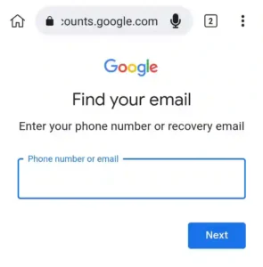 जब आप Forgot Email के ऑप्शन पर कि्लक करते है यहाँ पर आपको अगले पेज पर मोबाइल नंबर डालने का ऑप्शन दिखाई देता है तो अब आपको वह मोबाइल नंबर डालना है जिससे आपका Email Id बनाया गया था तो वह मोबाइल नंबर यहाँ डाले और Next पर कि्लक करे।