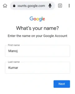 अब आपको अपने पेज पर अपना नाम डालने को कहाँ जायेगा तो यहाँ पर आपको वह नाम देना है जो Email Id बनाते समय दिया गया था तो यहाँ First Name और Last Name डालकर Next पर कि्लक करे।
