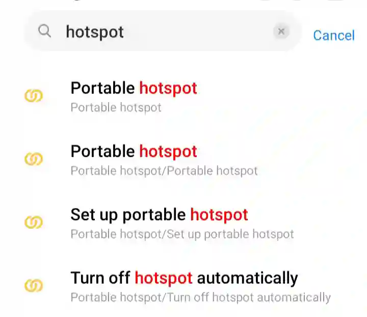 जिसका सबसे आसान तरीका है कि इन ऑप्शन को छोड़े और इस सेटिंग में दिये गये ऑप्शन सर्चबार में जो सबसे ऊपर उसमें कि्लक करे और यहाँ Hotspot लिखकर सर्च करे।